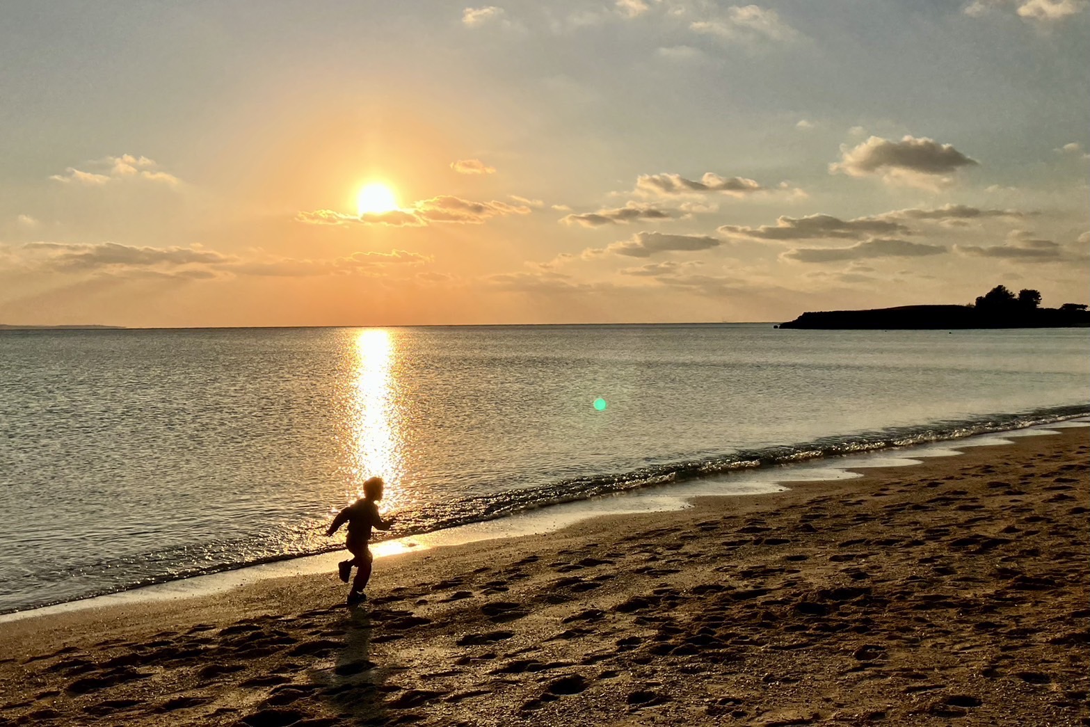 子どもの走る姿と海に映る夕陽がキレイに撮れました