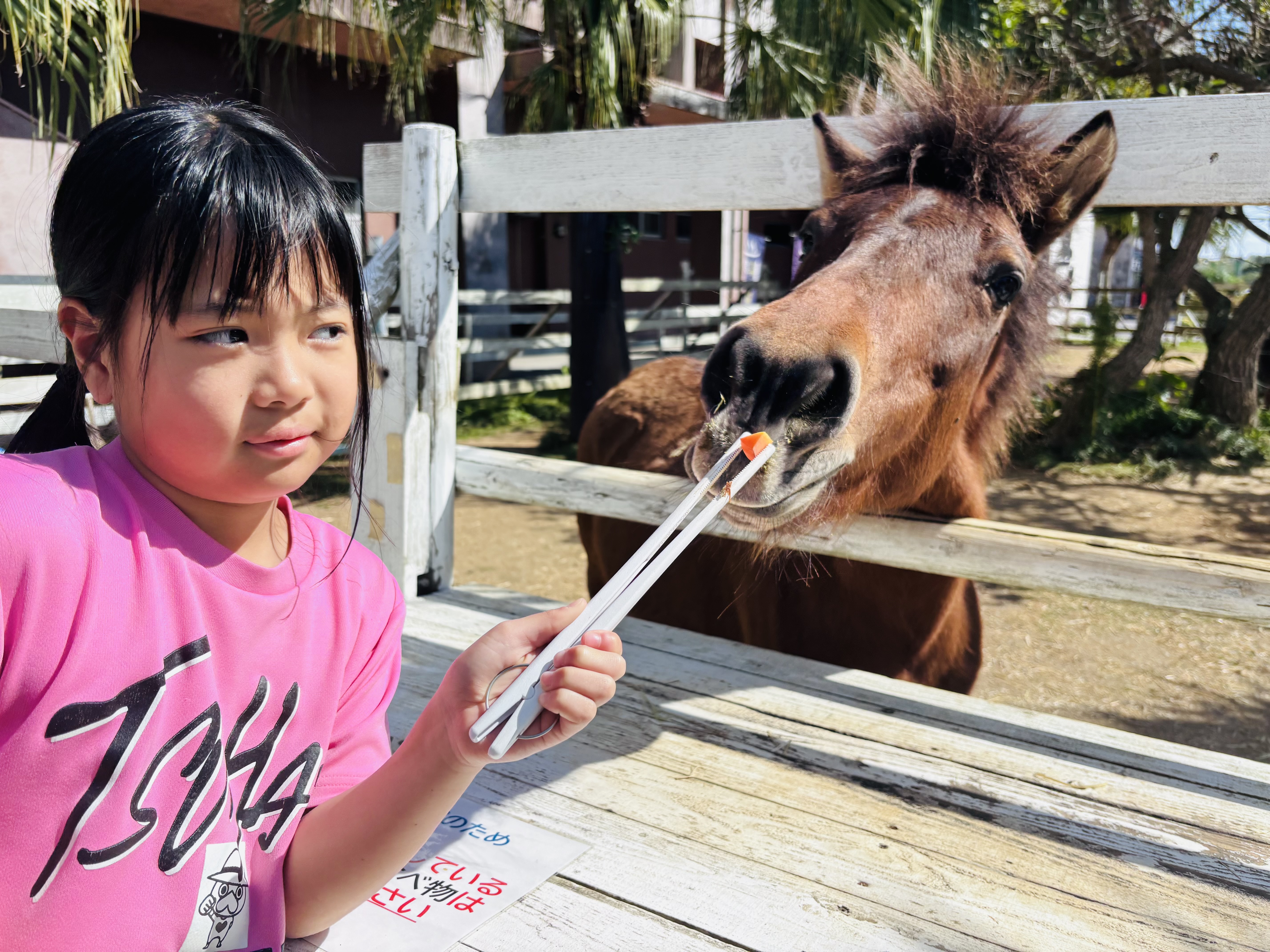 いつも陽気な小学3年生の娘は人参を必死に食べたがる馬にも動じず『そこのお馬さん、にんじん食べるぅ〜』っと言いながら餌やりしていた時の1枚