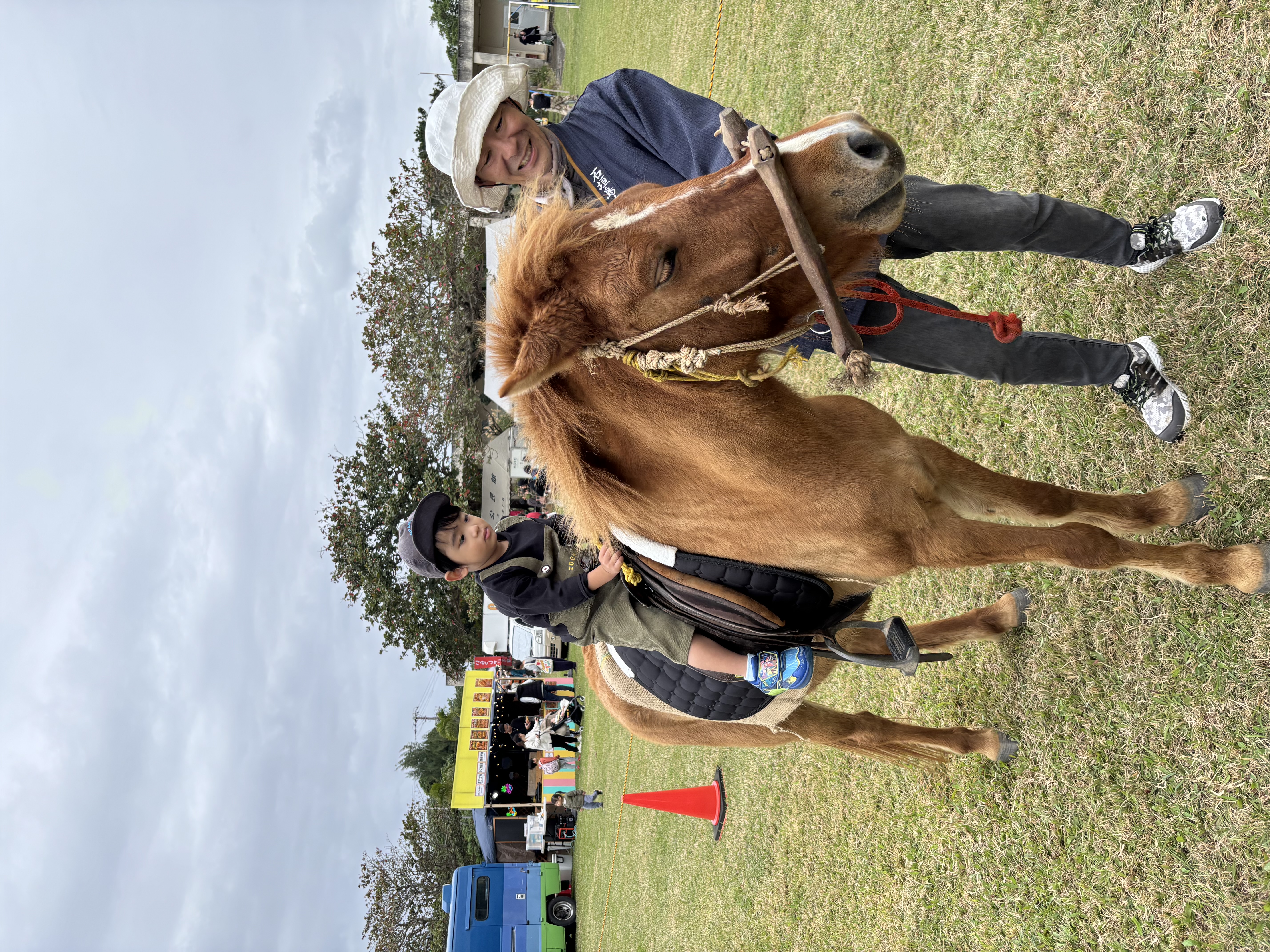 石垣島北部おいでよフェスタに遊びにいった際の乗馬体験にて。はじめは体験するつもりはなかったのですが、僕も乗りたいと意思表示し、乗って1周することになりました。 思ったよりも大きいお馬さんにあたり、途中怖がるかと思いましたが、緊張しながらも無事に乗り達成感を親子で得られ、とても楽しい思い出になりました。